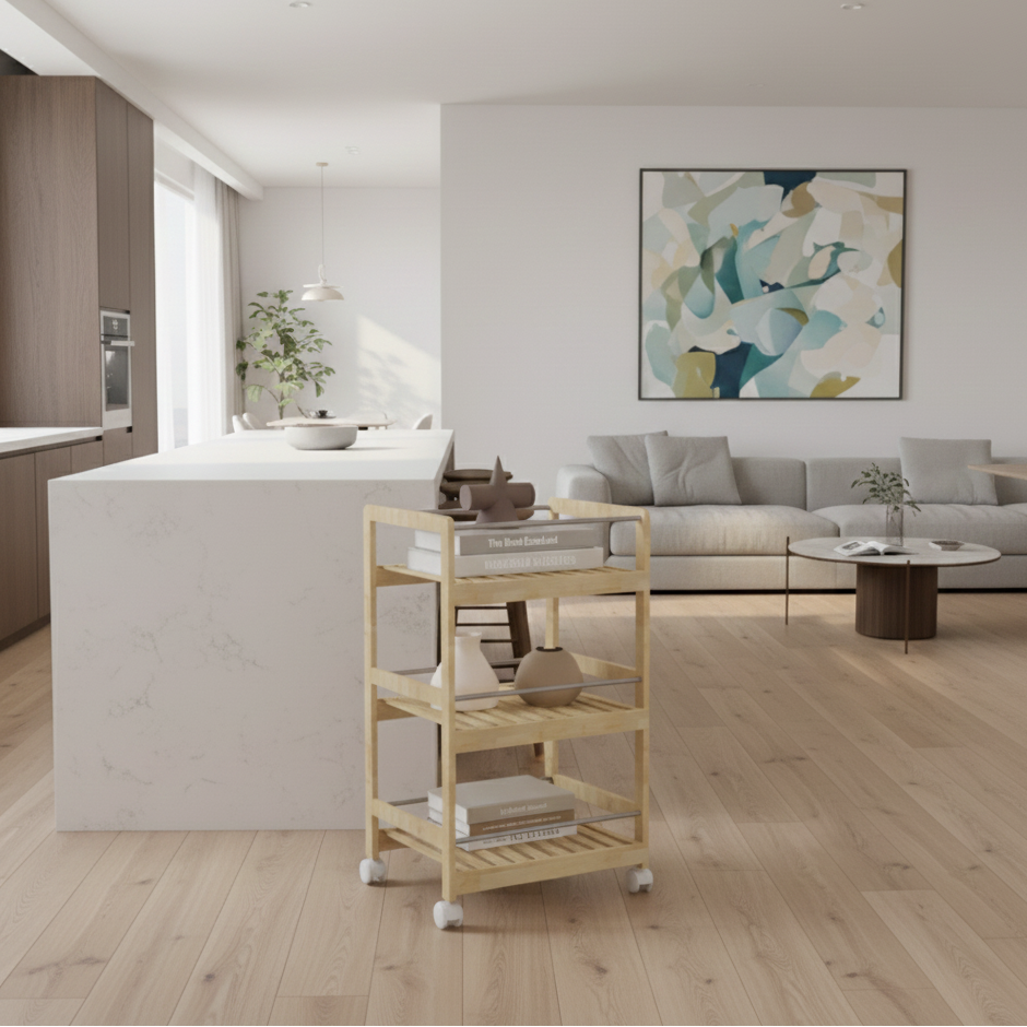 עגלת אחסון עשויה במבוק טבעי, בעיצוב מודרני ופונקציונלי.