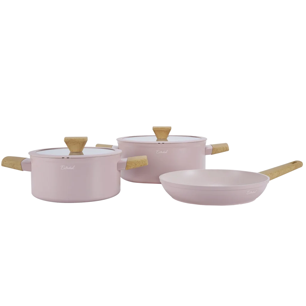 הסט בעל עיצוב וינטג׳ ייחודי עם גימורי סיליקון וידיות דמוי עץ רכות למגע ומבודדות חום. כלי הבישול שלנו מיוצרים מאלומיניום מובחר, בתהליך יציקה רב שכבתי ההופך אותם לחזקים ועמידים במיוחד, בעלי מראה עכשווי, נוחים לשימוש וקלים לניקוי. גוף האלומיניום העבה מבטיח חלוקת חום שווה ויעילה, לקבלת תוצאות בישול מרביות וחסכון בזמן ואנרגיה.