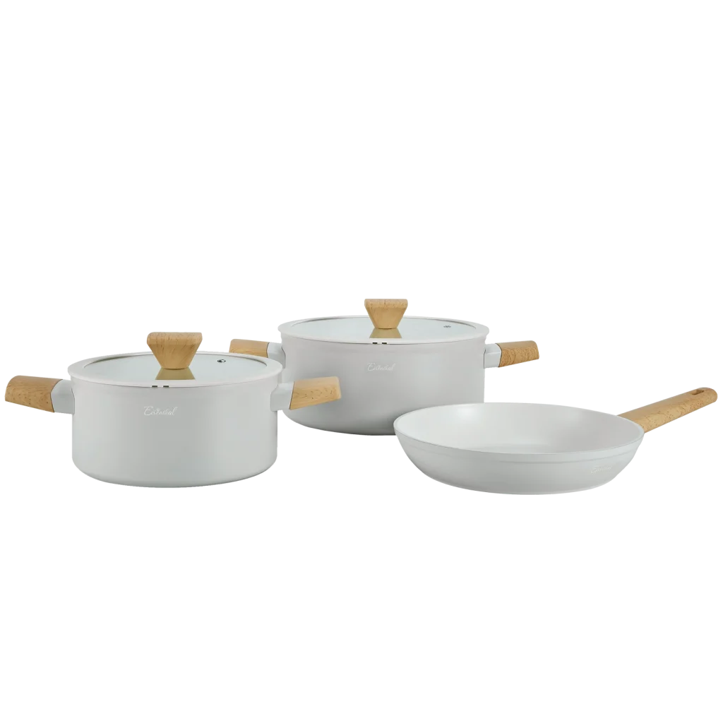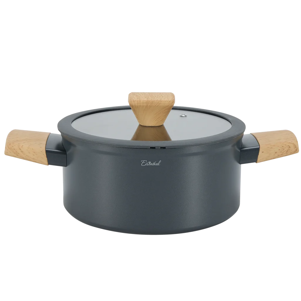 הסט בעל עיצוב וינטג׳ ייחודי עם גימורי סיליקון וידיות דמוי עץ רכות למגע ומבודדות חום. כלי הבישול שלנו מיוצרים מאלומיניום מובחר, בתהליך יציקה רב שכבתי ההופך אותם לחזקים ועמידים במיוחד, בעלי מראה עכשווי, נוחים לשימוש וקלים לניקוי. גוף האלומיניום העבה מבטיח חלוקת חום שווה ויעילה, לקבלת תוצאות בישול מרביות וחסכון בזמן ואנרגיה.
