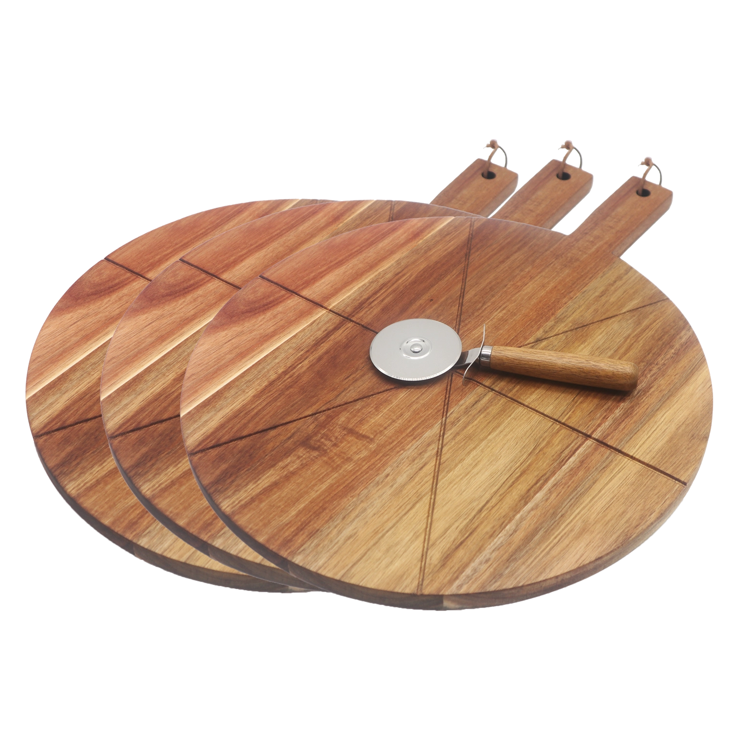 3 משטחי הגשה המיועדים לחיתוך והגשת פיצה וחותכן מפלדת אל חלד בשילוב עץ.